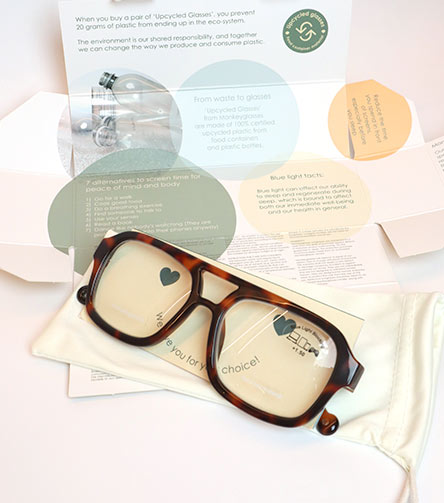 All lenses in the Upcycled Glasses series feature a built-in Blue Light filter that reduces harmful blue light from digital screens. Read more about 'Blue light glasses' here